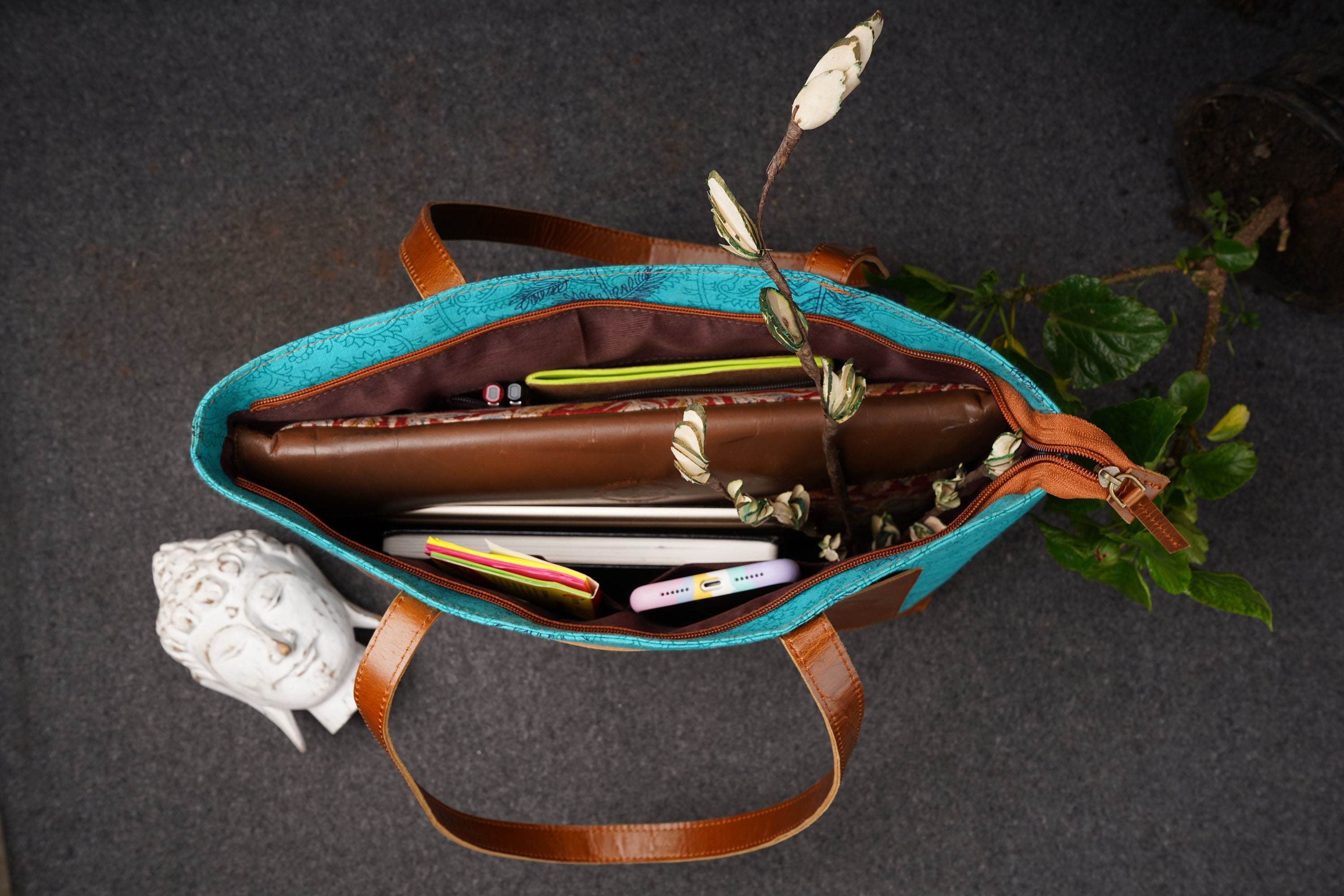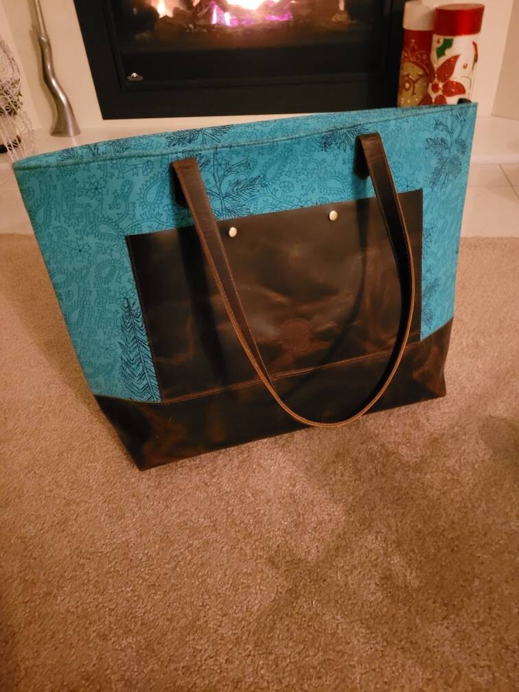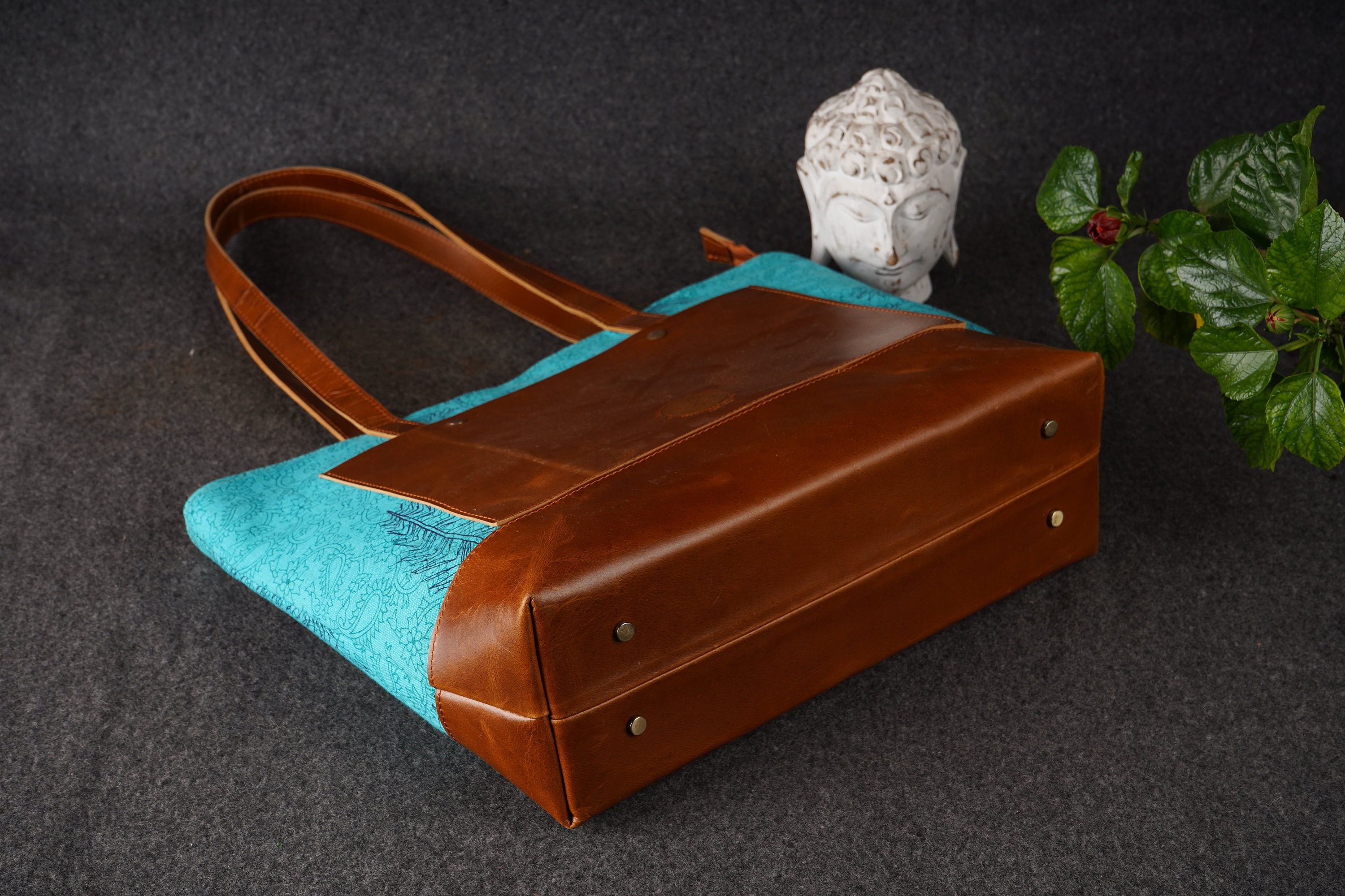 I love this bag! The colours are exactly as they appear in the image. I have the turquoise and dark leather colours. There's lots of room for my laptop and other stuff. The bag is quite stiff but I think the leather will loosen up a bit as I use it.