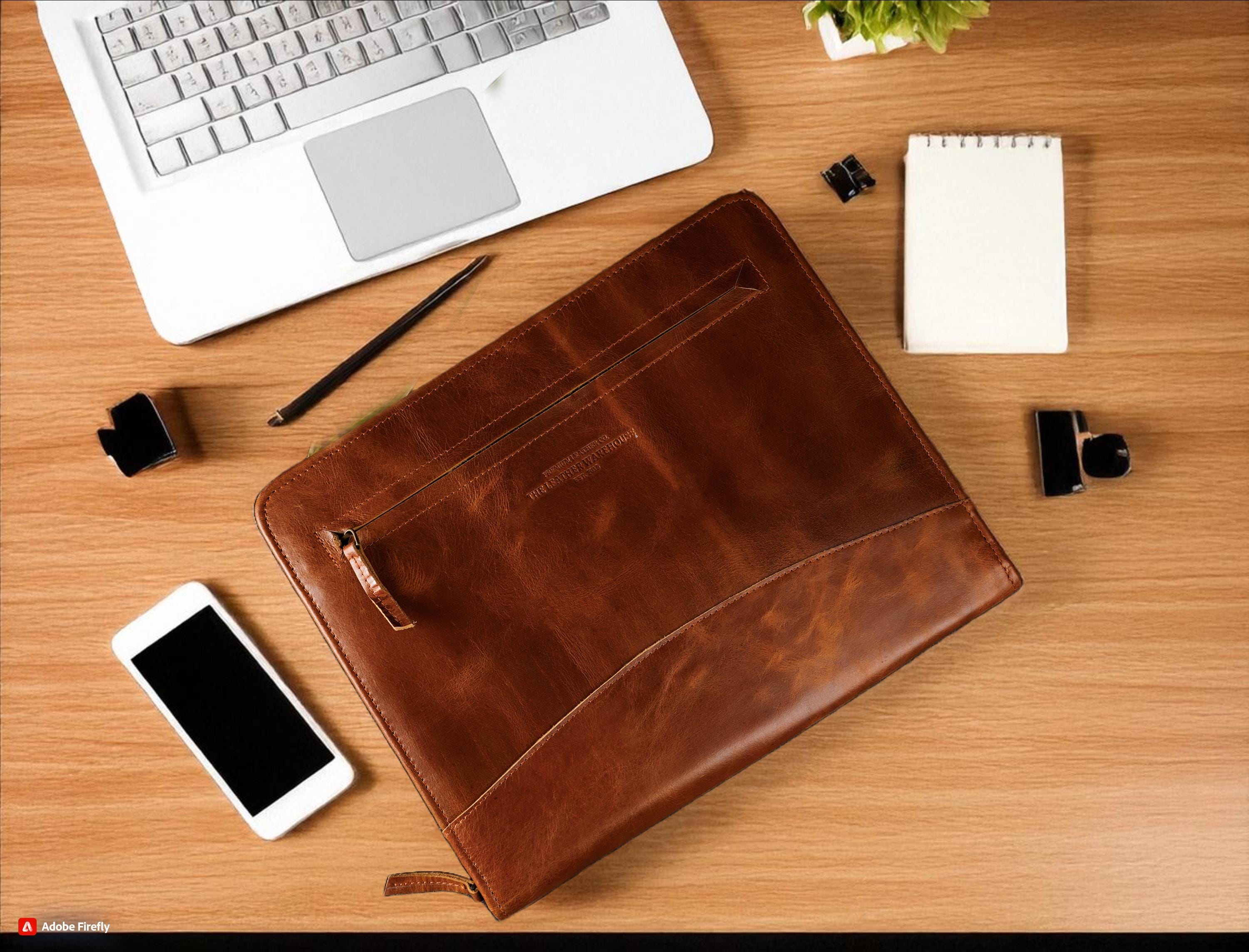 This Leather Portfolio is 100% Hand-made, and has a minimalist design, that will organize your meeting essentials and ease your day.