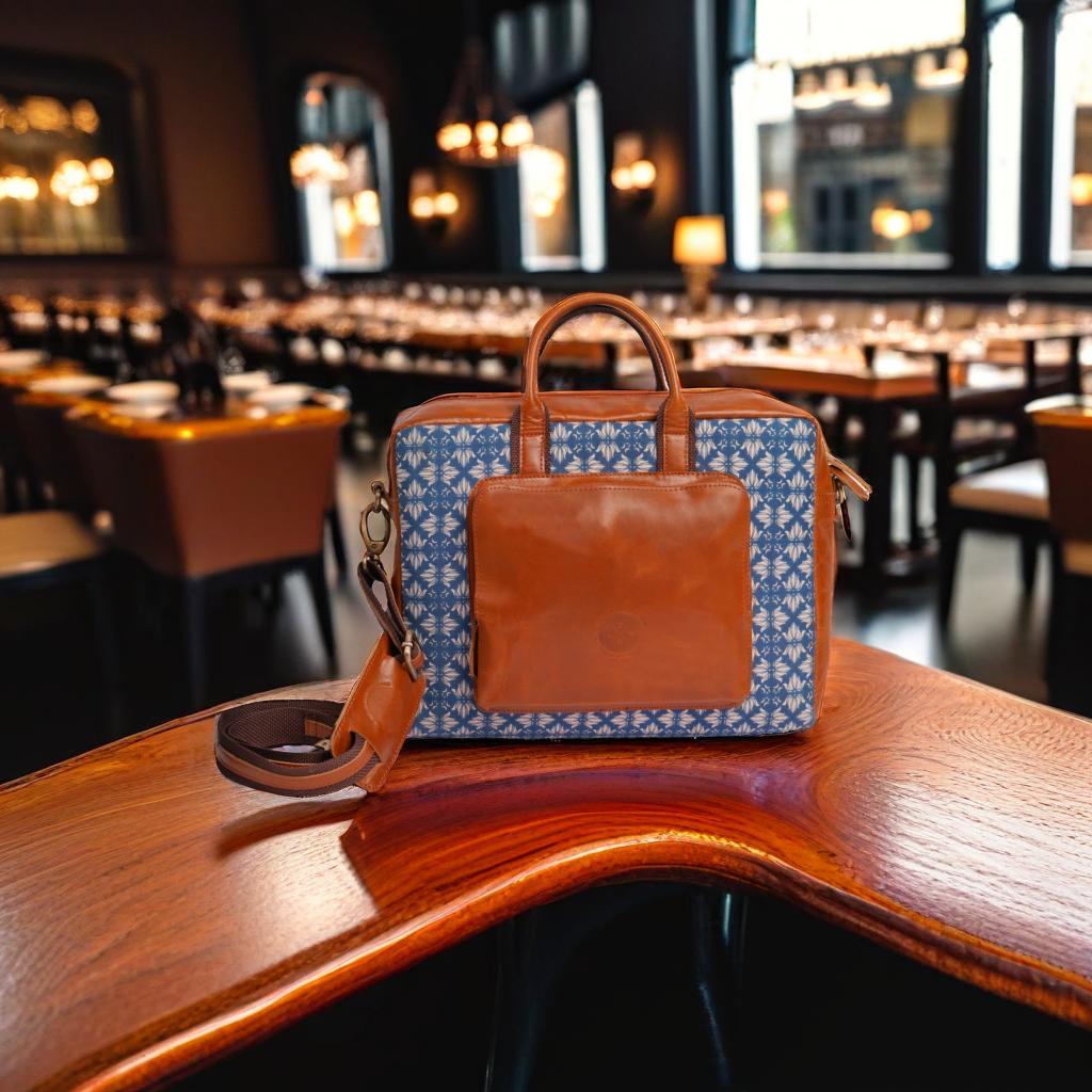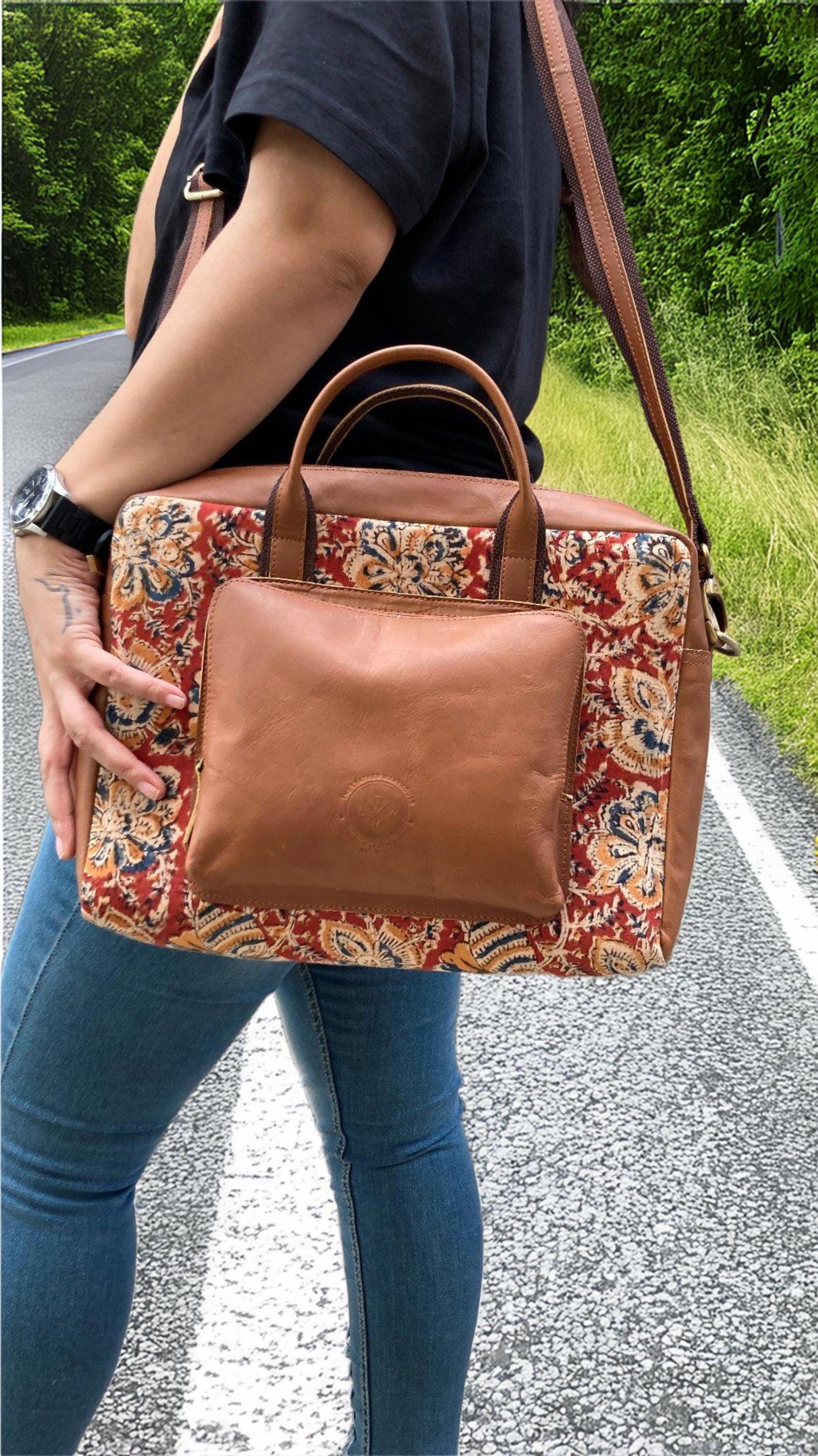 Discover timeless craftsmanship with this artisan leather and hand-printed fabric bag, designed for modern professionals and style-conscious travelers. This mixed material laptop bag blends durable genuine leather with vibrant, handcrafted textile patterns—making every piece uniquely yours.