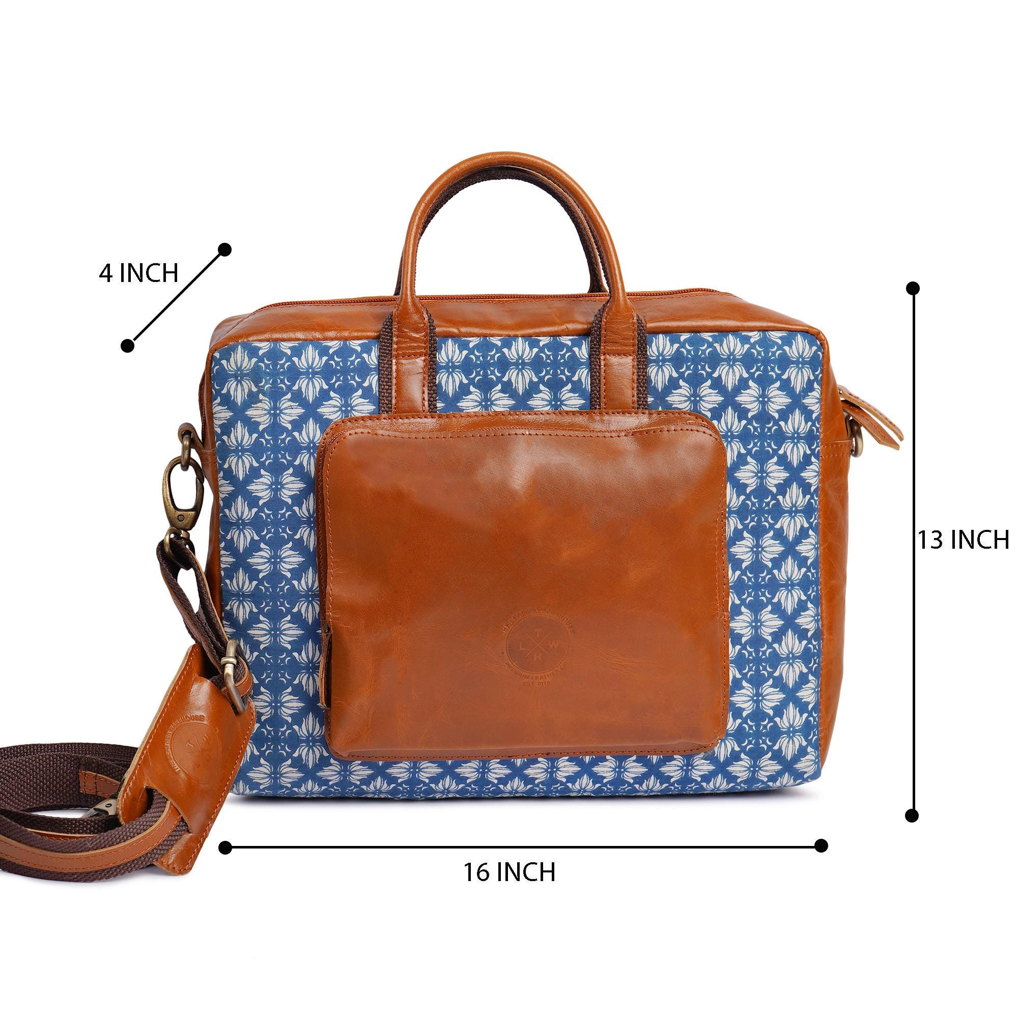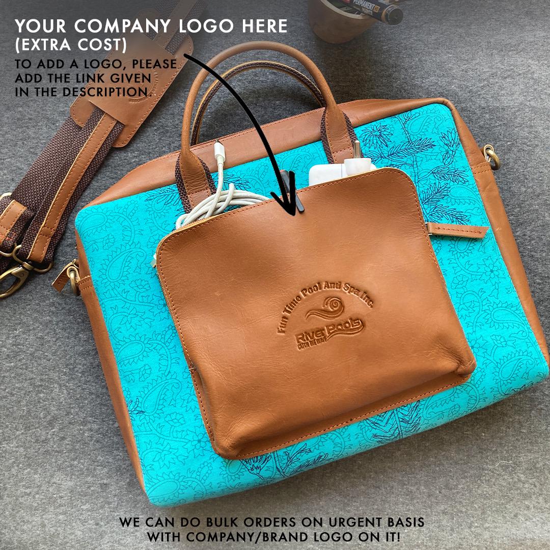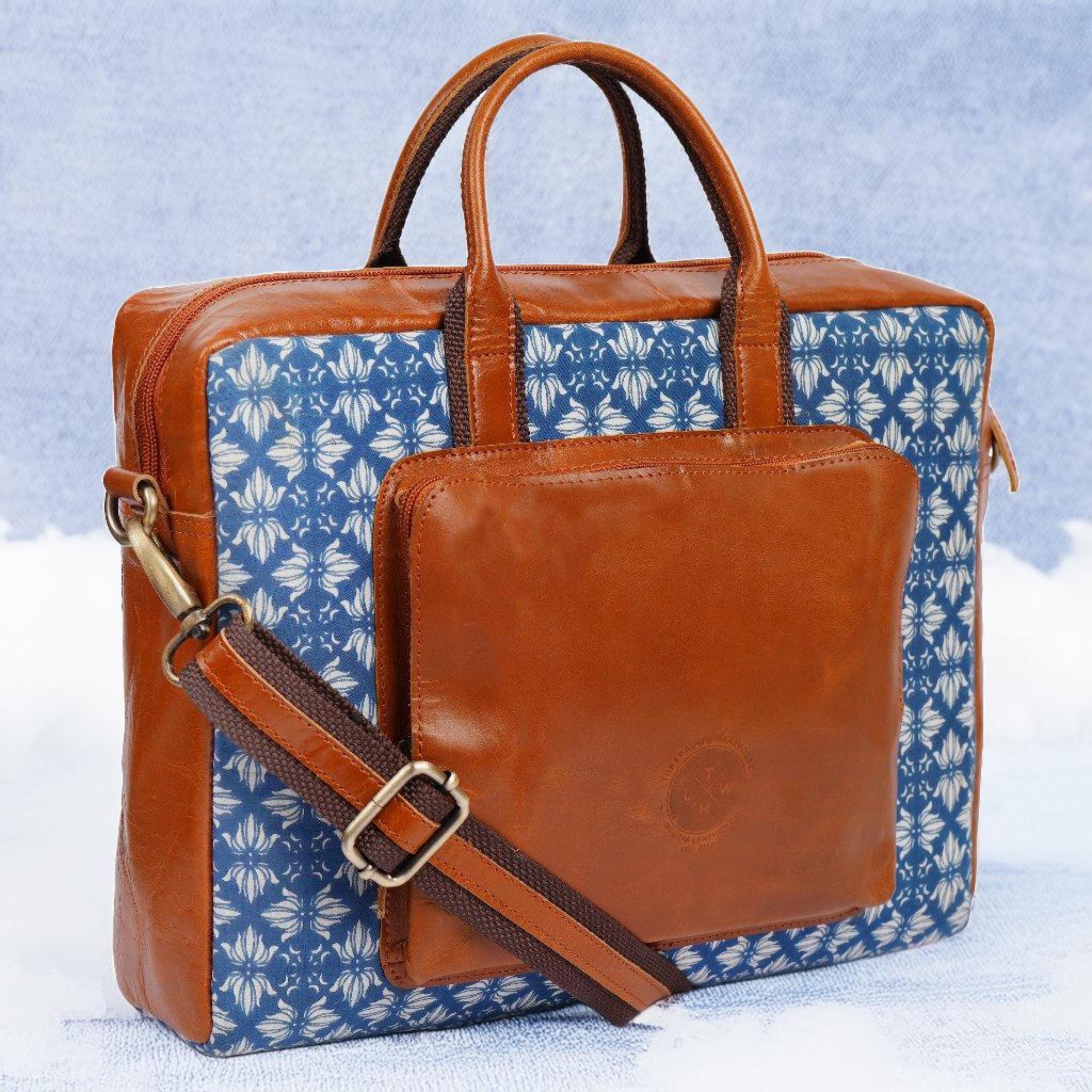 Elevate your everyday office look with this handprinted fabric and genuine leather laptop bag — a perfect mix of tradition and style. Handcrafted by skilled artisans, this durable messenger bag fits your laptop, notebook, and essentials with ease. Ideal for work, travel, or meetings, it’s both functional and fashionable.
