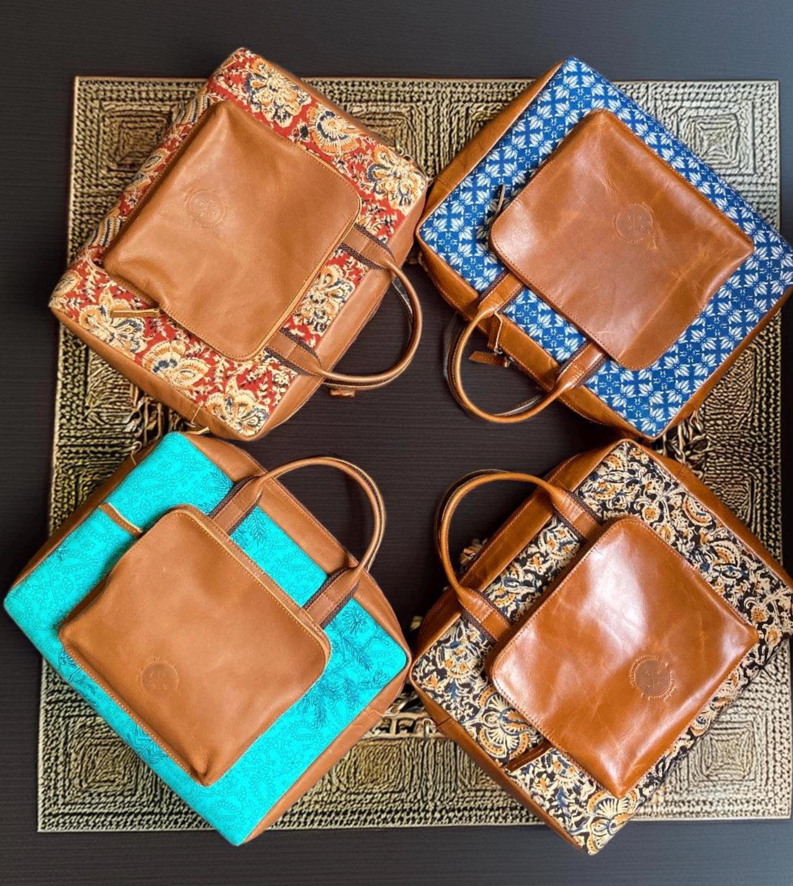 These keywords are tailored to highlight the unique combination of leather and hand-printed fabrics in your products, appealing to consumers searching for artisanal and personalized bags.