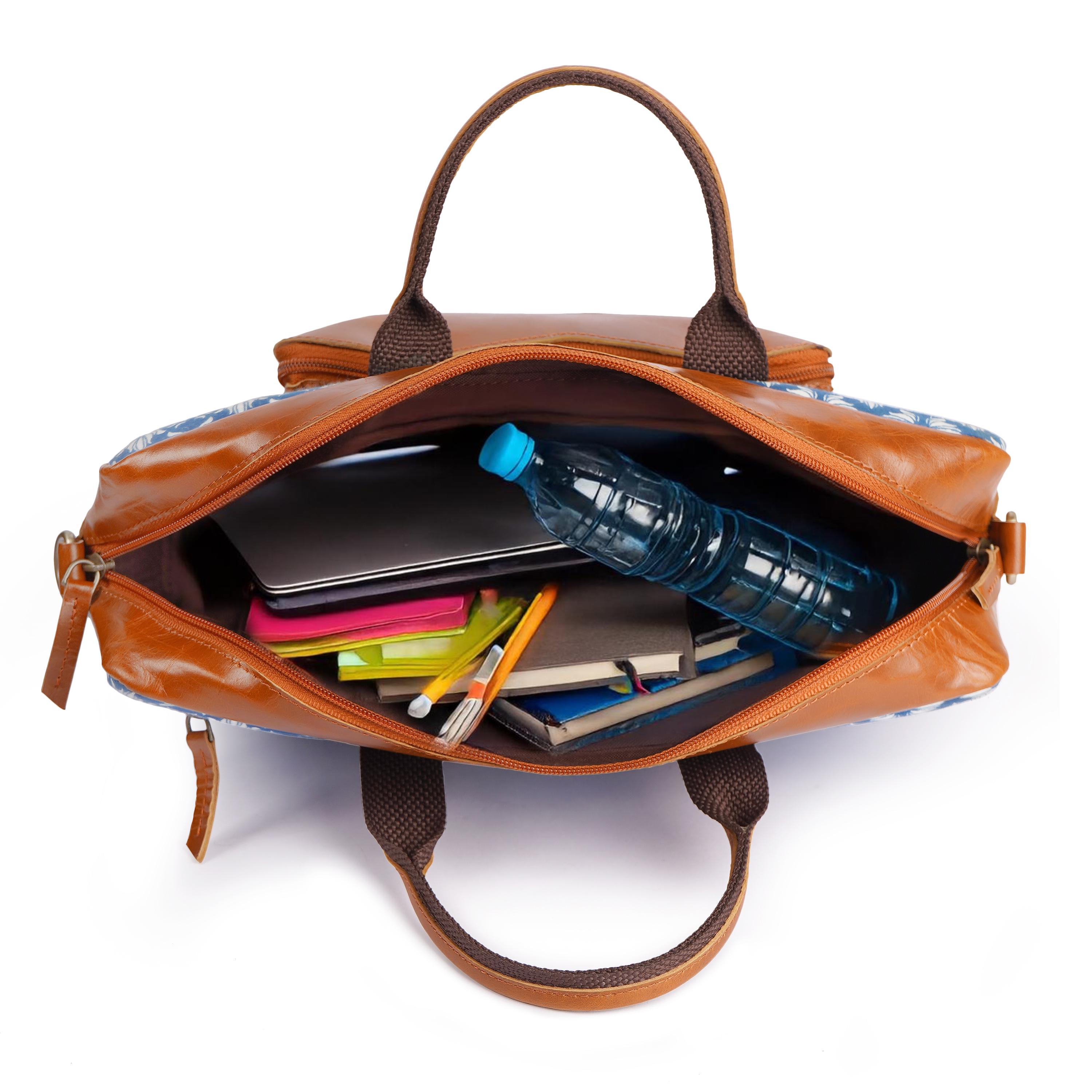 "Artisan Leather & Printed Fabric Laptop Bag – Stylish Blend for Work & Travel"